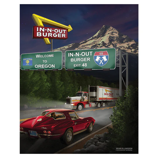 يحتفل هذا القميص بأول فرع لمطعم إن-إن-آوت برجر® في ولاية أوريغون. تحت سماء شتوية قاتمة، مع لافتة إن-إن-آوت® شامخة فوق الأشجار، يُصوّر القميص إحدى شاحنات التوصيل التابعة لنا وهي تمر بسيارة رياضية حمراء كرزية.